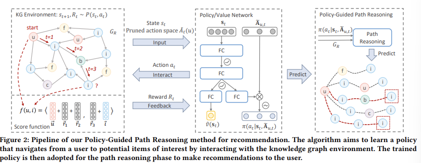 - 우리의 경로 추론 프로세스는 KG에서 rich한 heterogeneous imformation을 통합하고 엔티티 간의 multi-hop 상호 작용을 캡쳐하는 학습된 정책 네트워크에 의해 guide됨.