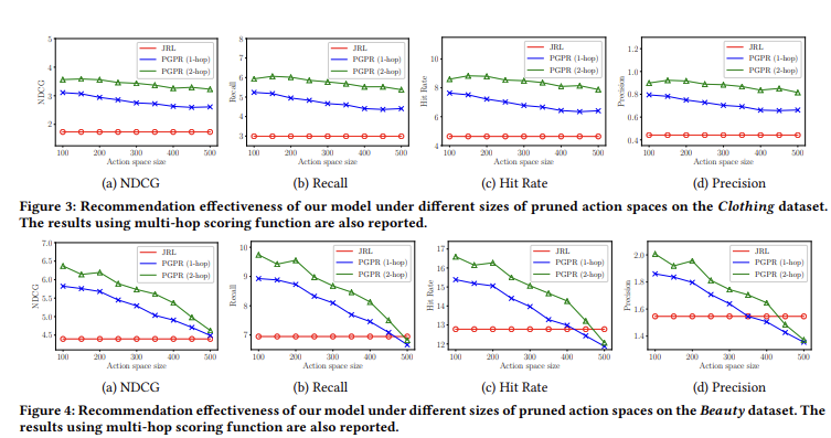 - 비교를 위해 PGPR외에 기준 방법 중 최고였던 JRL의 성능도 기록함. JRL의 성능은 액션 공간에 의존하지 않음