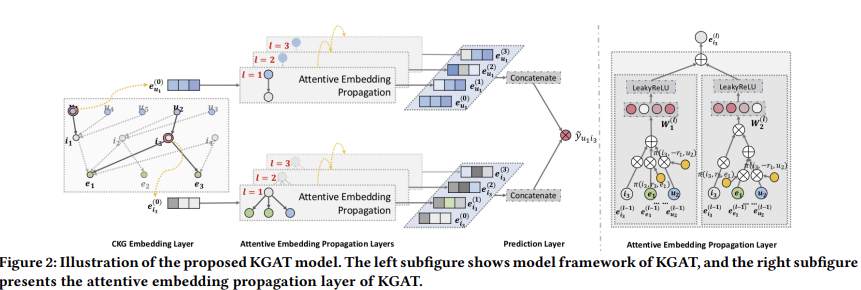 중요한 관계에는 더 큰 값을 부여하기 위해 총 3개의 구성요소로 구성됨.( Information Propagation , knowledge-aware attention , information aggregation )