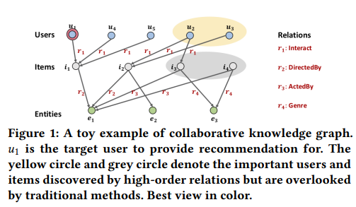 - high-order relations : 하나 또는 여러개의 연결된 속성으로 두 item을 연결하는 관계.1-hop이 아니라 여러 hop을 거쳐 연결된 관계 정도로 이해함.